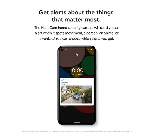 With smart alerts powered by AI, the Nest Cam can tell the difference between people, animals, and vehicles, notifying you only when it really matters. View live video, talk through the built-in speaker, or review the last three hours of recorded events directly from the Google Home app. Perfect for peace of mind, indoors or outdoors.
